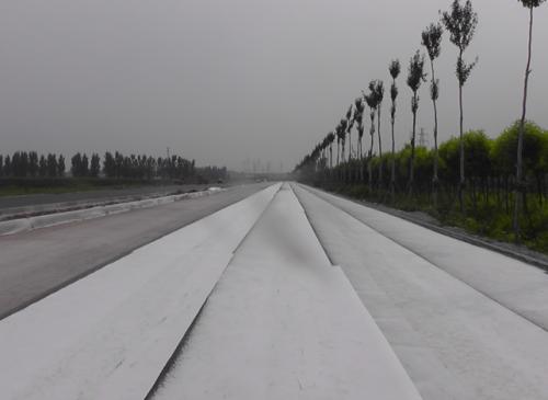 在熱拌瀝青混合料路面下安裝防水層,是保護(hù)和延長(zhǎng)道路壽命的佳方法之一。一般材料的防裂布在高溫時(shí)會(huì)變形、損壞,聚酯玻纖布是由非織造玻纖/聚酯制造。可以經(jīng)受改性瀝青混凝土的高溫施工。聚酯玻纖布的這種高溫穩(wěn)定性將給路面提供一個(gè)連續(xù)、不變形的防水層,有效地防止水分滲透,避免因水分滲透而導(dǎo)致的路面層與基層的損壞。